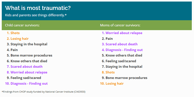For example, in an online resource discussing pediatric medical traumatic stress, the Health Care Toolbox quotes research conducted by Children’s Hospital of Philadelphia, where the self-reported list of most traumatic events were almost opposite each other for child cancer survivors and their mothers.1