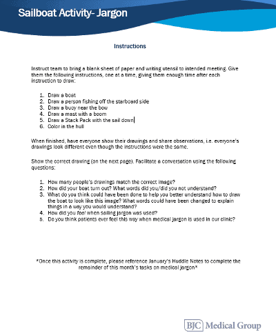 Our education included discussions around what jargon is, its impact on safety and experience, and perceptions of providers that do and do not use jargon. The activity for this month, courtesy of OSF Medical Group from their presentation at the 2024 ELEVATE PX Conference, was a “boat activity,” requiring participants to draw a sailboat following instructions that included sailing jargon. This has been one of our most impactful activities, one that we continue to use in other presentations including new provider and new leader orientations and education for MA trainees and preceptors!